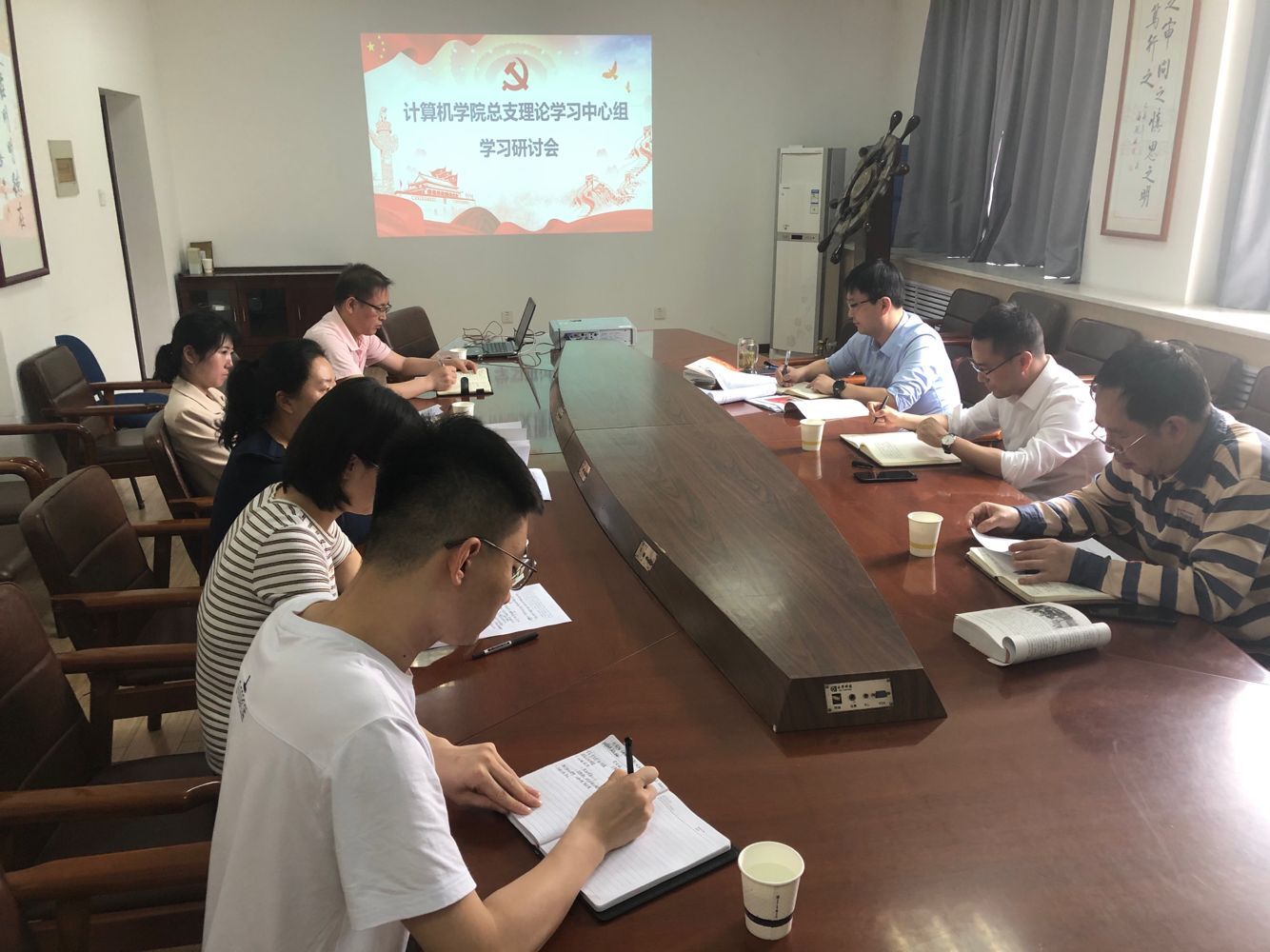 按照太阳成集团tyc122cc党总支2021年理论学习中心组学习计划,太阳成集团tyc122cc党总支于5月21日上午10:00在莲湖校区教学北楼319举行了理论学习中心组交流研讨会,主题为 “习近平总书记在党史学习教育动员大会上的重要讲话”和“新民主主义革命时期历史”的学习交流。党总支书记胡红亮主持会议,公司党委宣传部副部长战非到会指导,理论学习中心组全体成员参加。