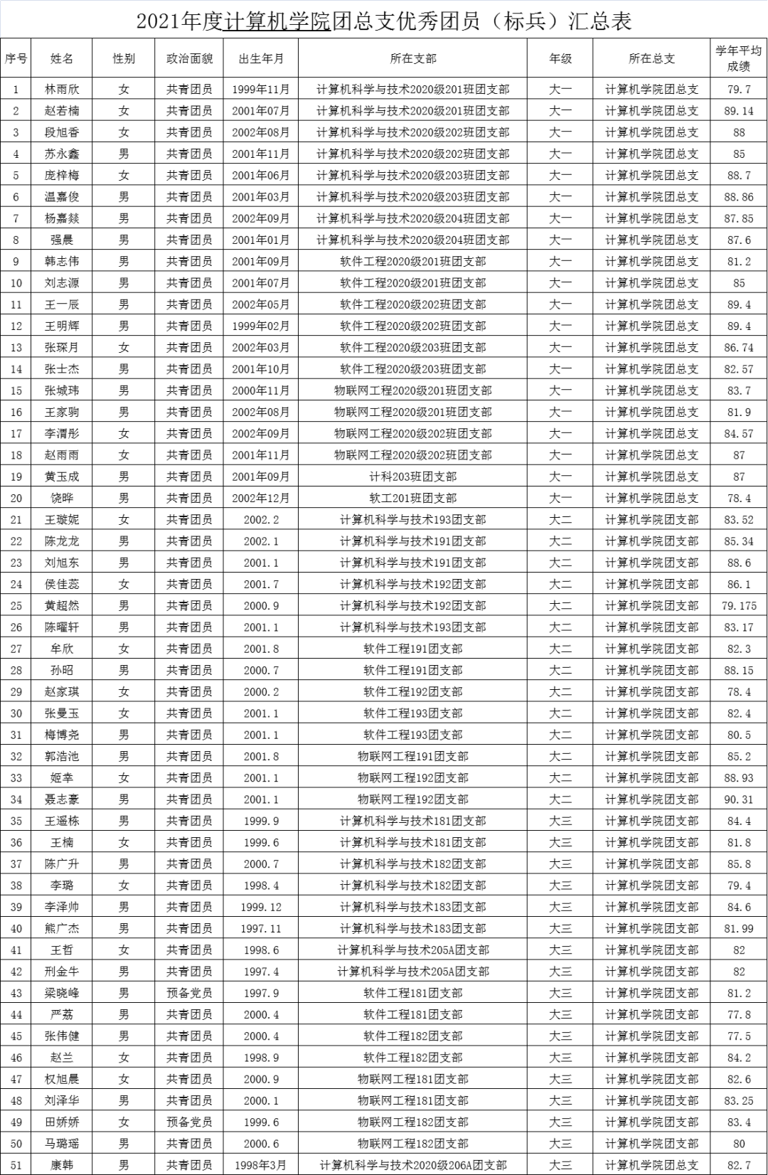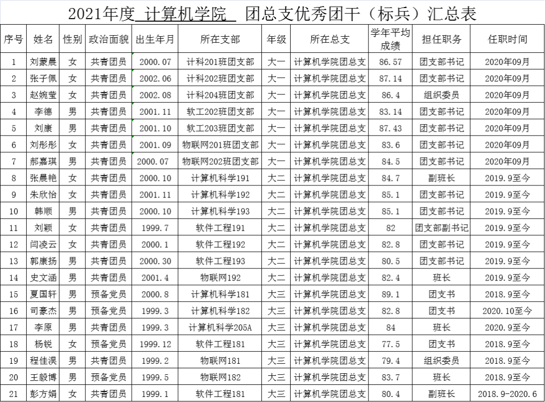 按照校团委《关于开展2021年度122cc太阳成集团官网共青团先进集体和优秀个人的评比表彰》文件要求,计算机学院团总支已全部完成评比工作。各班级团支部依据支部投票结果评预推荐对象,公司团总支结合团支部青年大学习、主题团日活动、团员团干日常考核、团支部建设等情况,全面并根据上一学年考试成绩进行最终评定,确定最终推荐对象。现将拟订优秀团员(标兵)、优秀团干(标兵)、优秀团支部和星级志愿者名单进行公示。