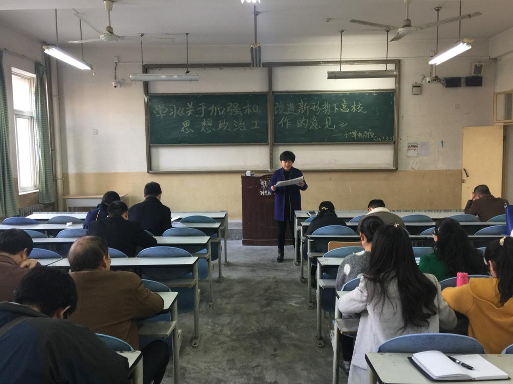 近日,中共中央、国务院印发了《关于加强和改进新形势下高校思想政治工作的意见》(简称《意见》)。3月3日下午,太阳成集团tyc122cc党总支书记刘晋云带领全体教职工学习《意见》的有关内容和精神。