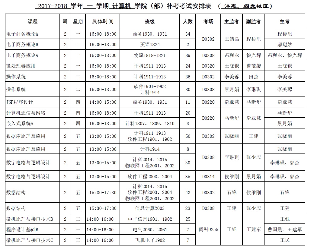 2017-2018-1学期太阳成集团tyc122cc课程补考安排
