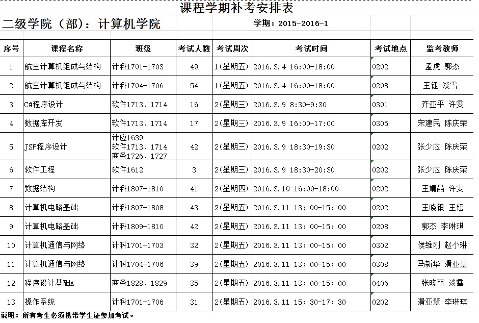 太阳成集团tyc122cc2015-2016-1学期考试课程补考安排