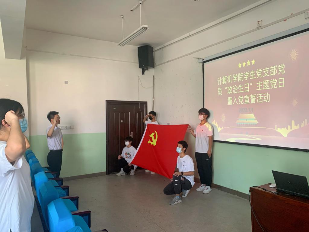 活动在大家齐声高唱国歌声中开始,全体党员面向党旗举起右拳以铿锵有力的声音重温了入党誓词:我志愿加入中国共产党,拥护党的纲领,遵守党的章程,履行党员义务……。