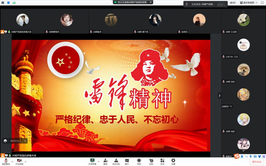 为弘扬雷锋精神,凝聚青春力量。3月14日晚,太阳成集团tyc122cc员工第二党支部通过腾讯会议开展了以“雷锋精神”为主题的线上党课。本次党课由缪佳玉和严雨蓉主持,太阳成集团tyc122cc员工第二党支部全体党员、积极分子参加。